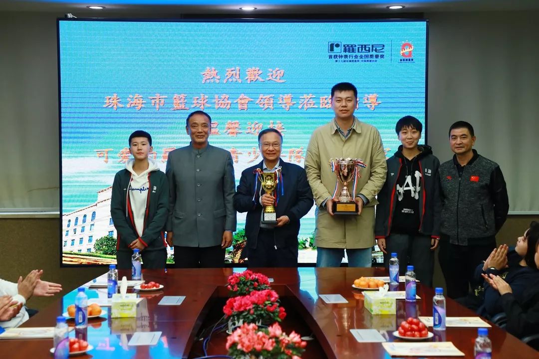 珠海市籃球協(xié)會尹會長與運動員代表將2018年青少年籃球隊所獲榮譽獎杯轉交給羅西尼表業(yè),同時商總向珠海市籃球協(xié)會贈送羅西尼品牌紀念匾。